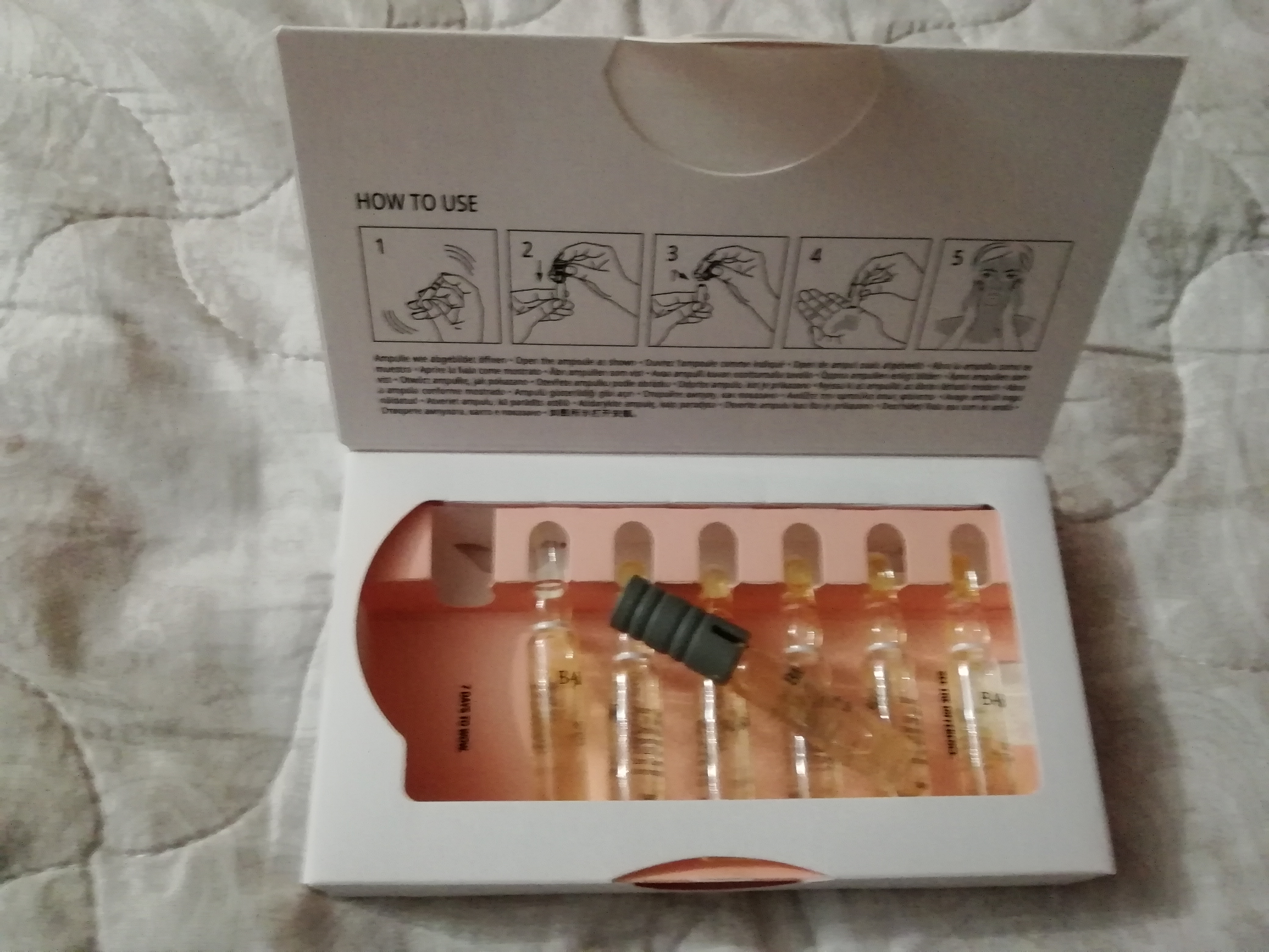 Слегка встряхните ампулу, оберните её горлышко косметической салфеткой или вставьте её в прилагаемое к упаковке пластиковое приспособление для открывания ампул. Резким движением отломите верхнюю часть ампулы по нижнему цветному кольцу.