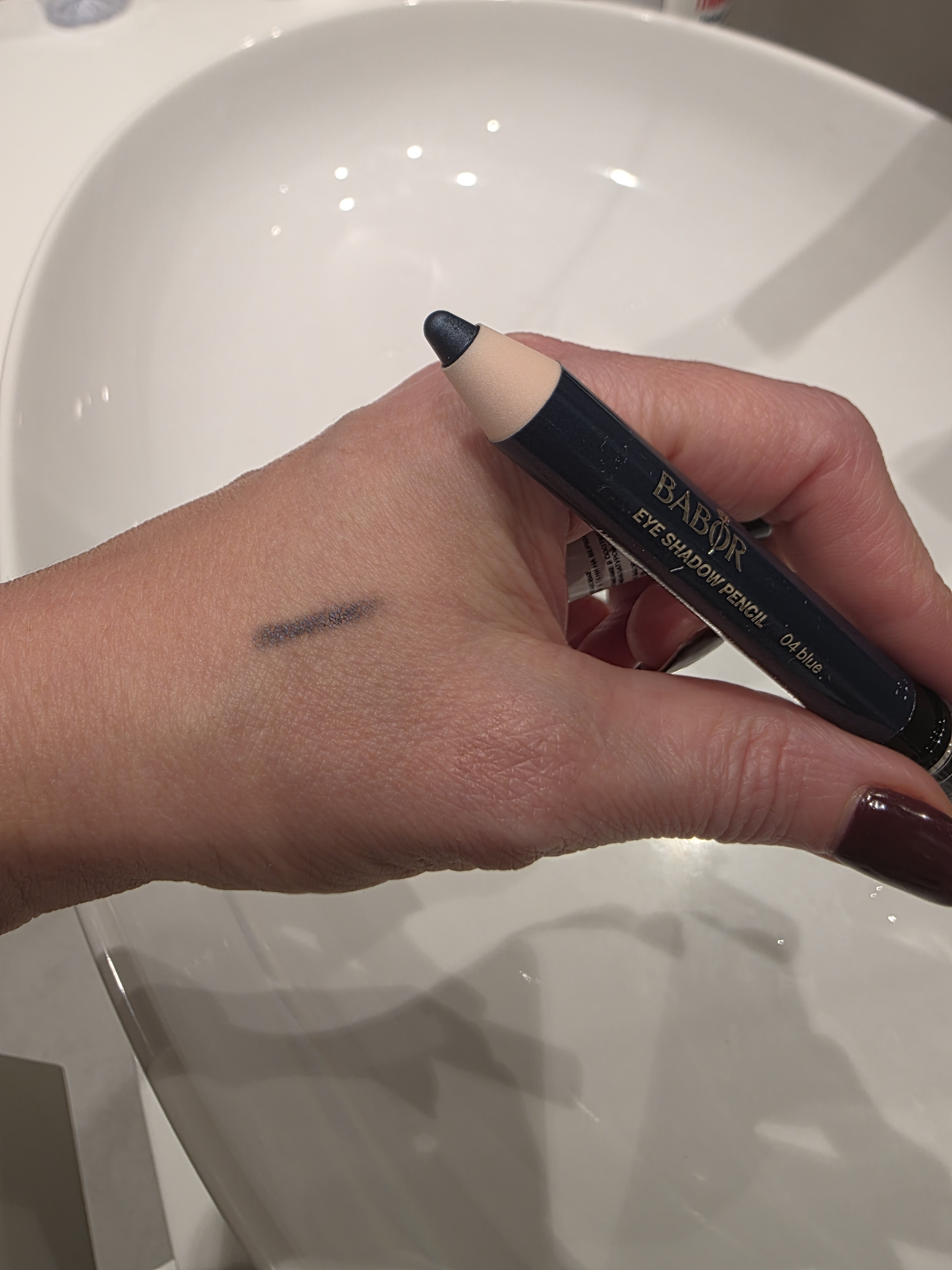 Отличный карандаш холодного синего цвета без сильного блеска, но глянцевый. Довольно стойкий и удобный в нанесении.